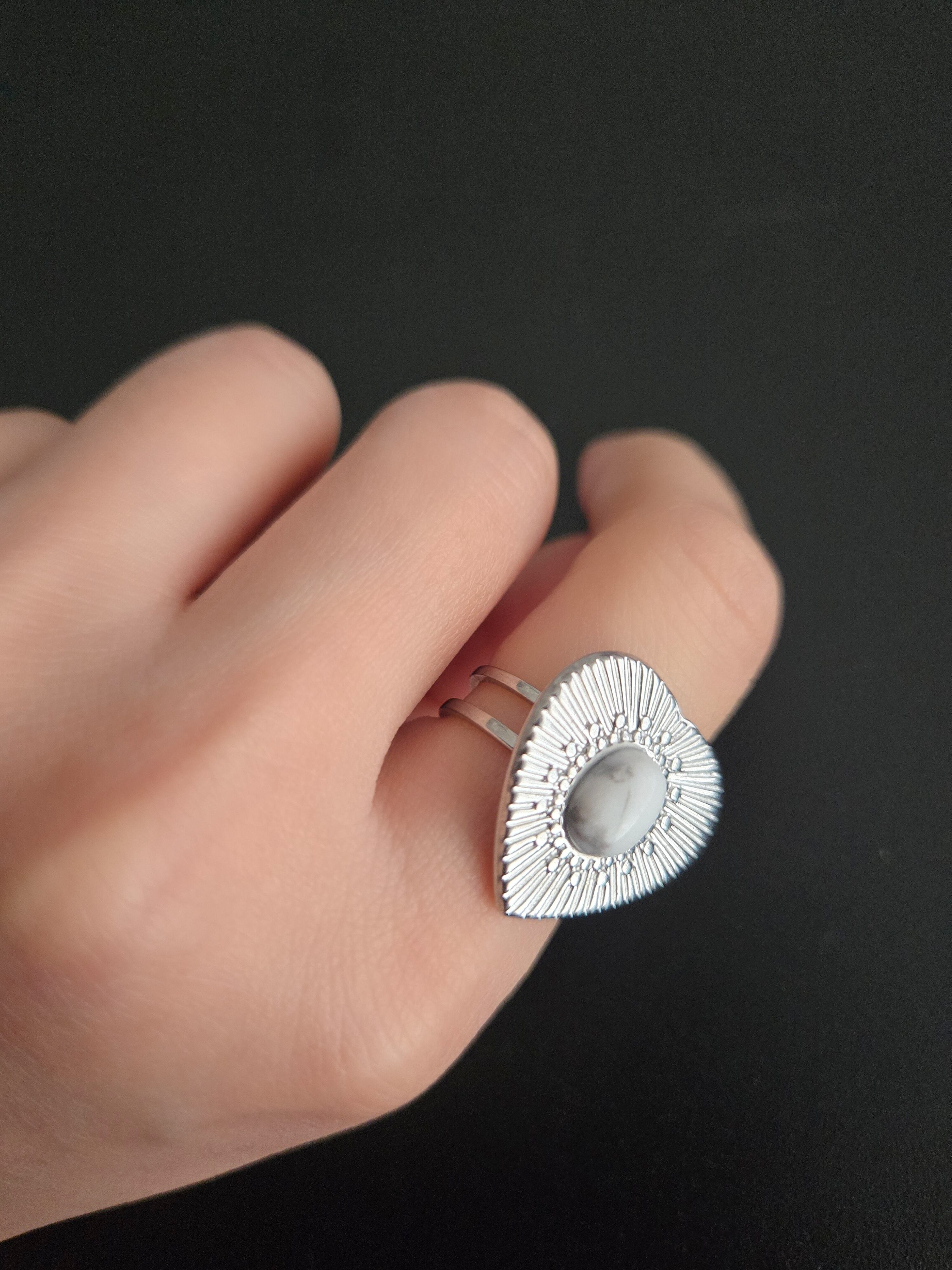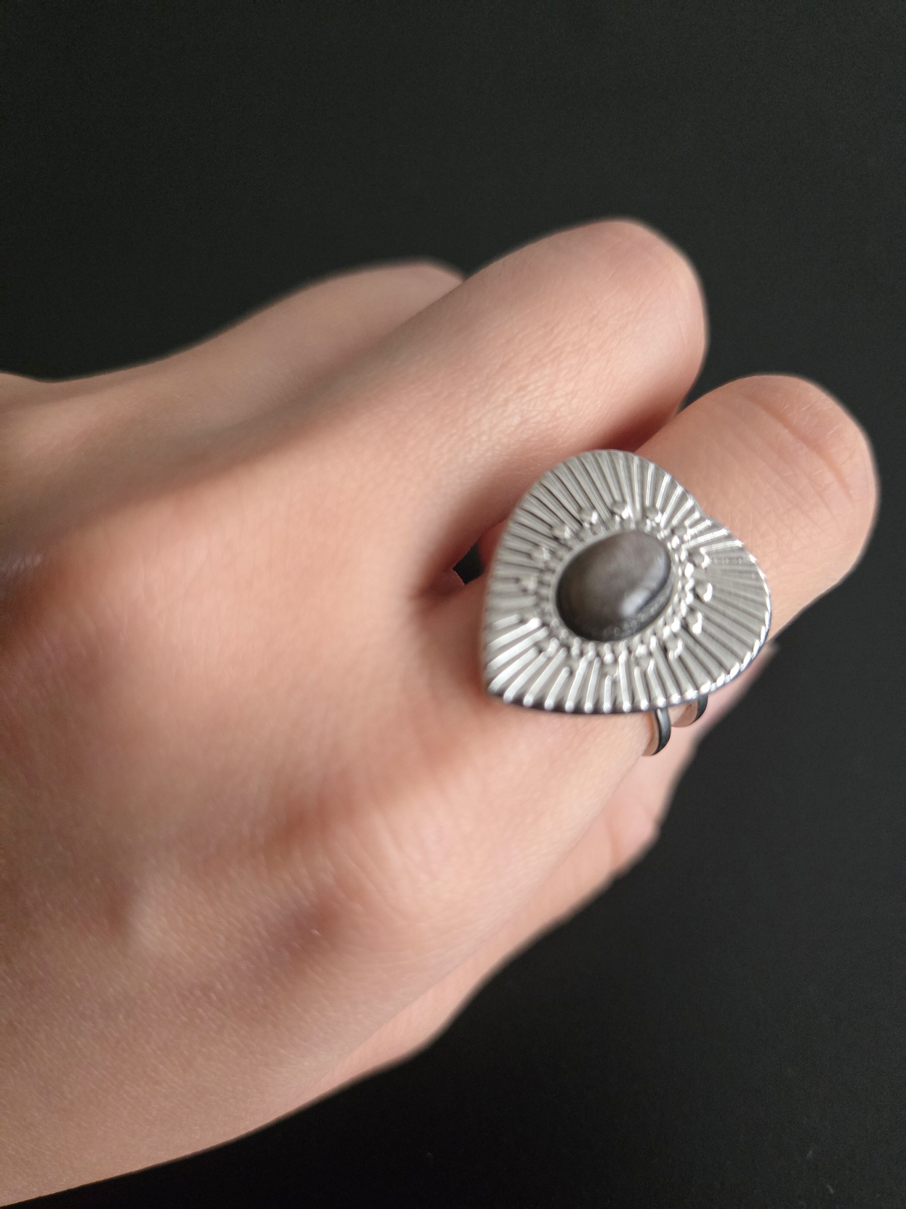 存在感のある大ぶりなハートのステンレスリングが印象的なデザイン。