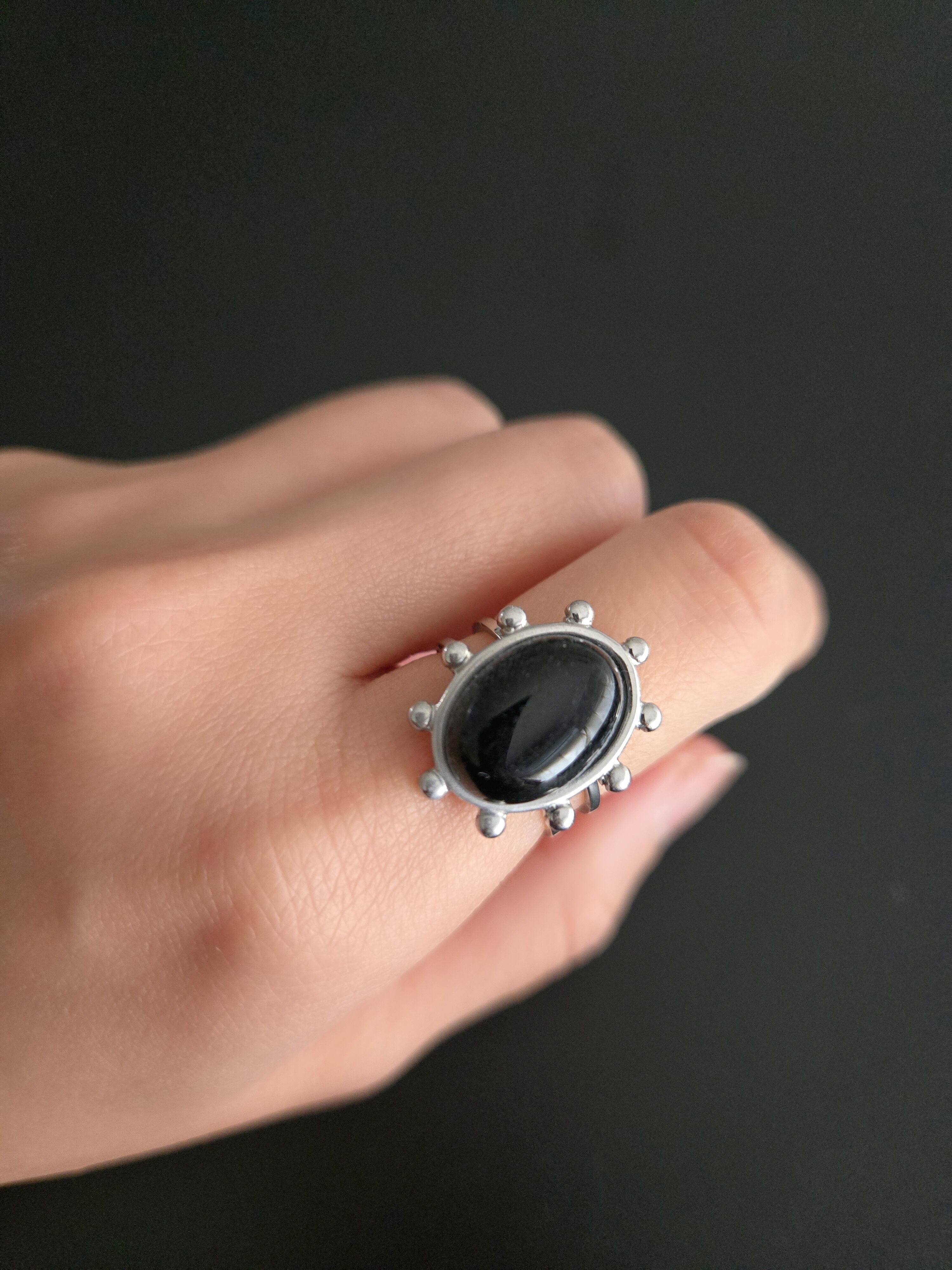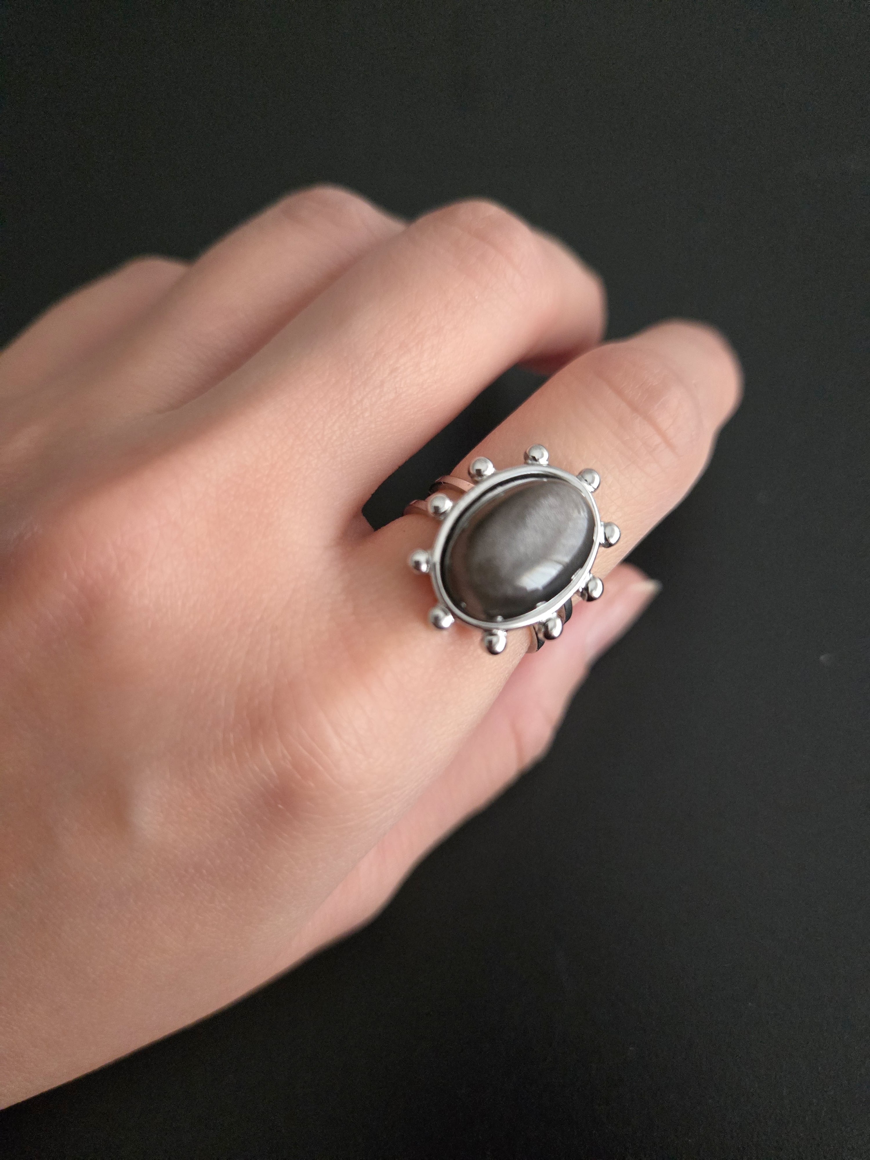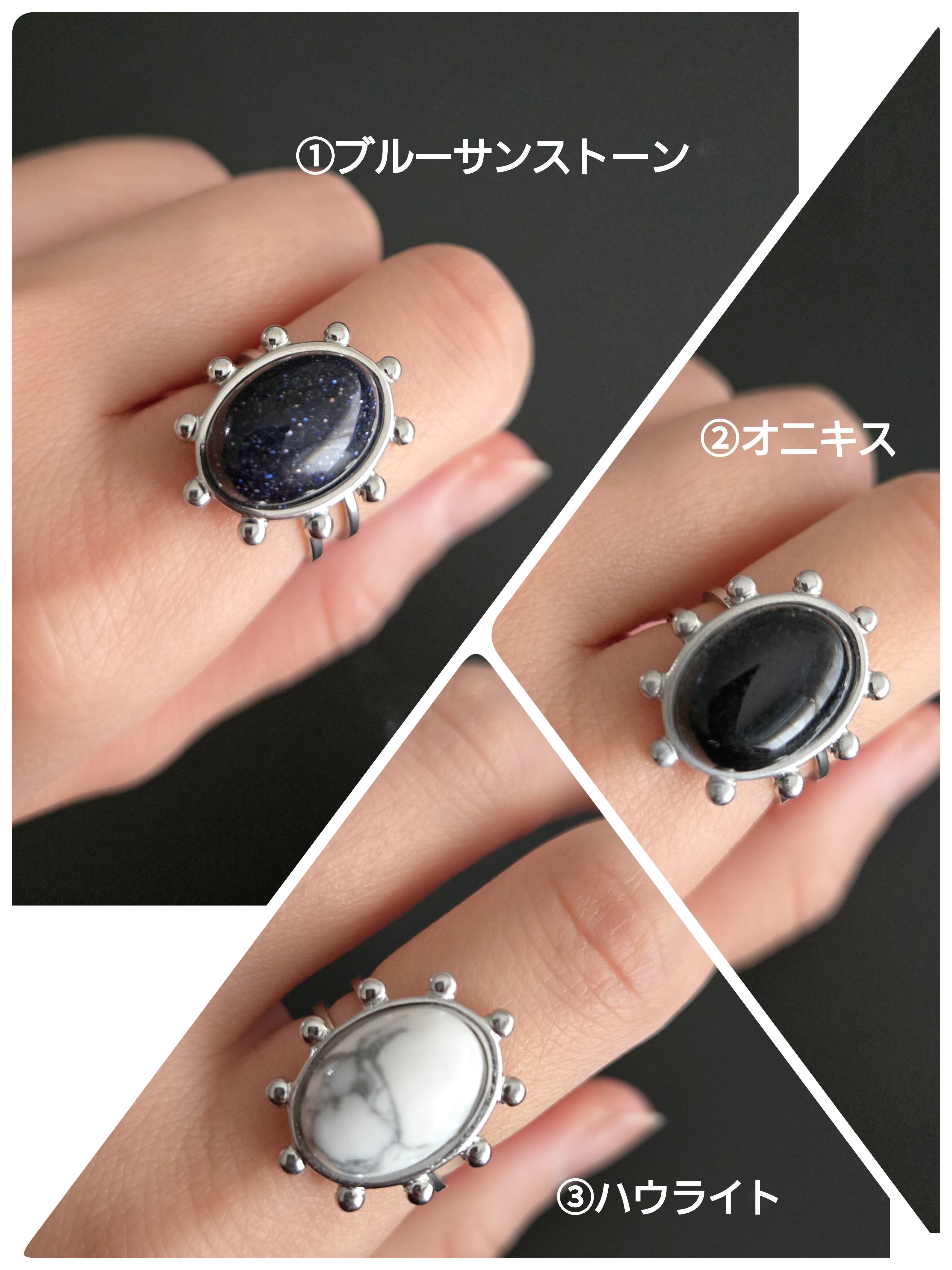 大きなオーバル型の天然石を中心に、繊細な粒状の装飾を施したユニークなデザインリング。