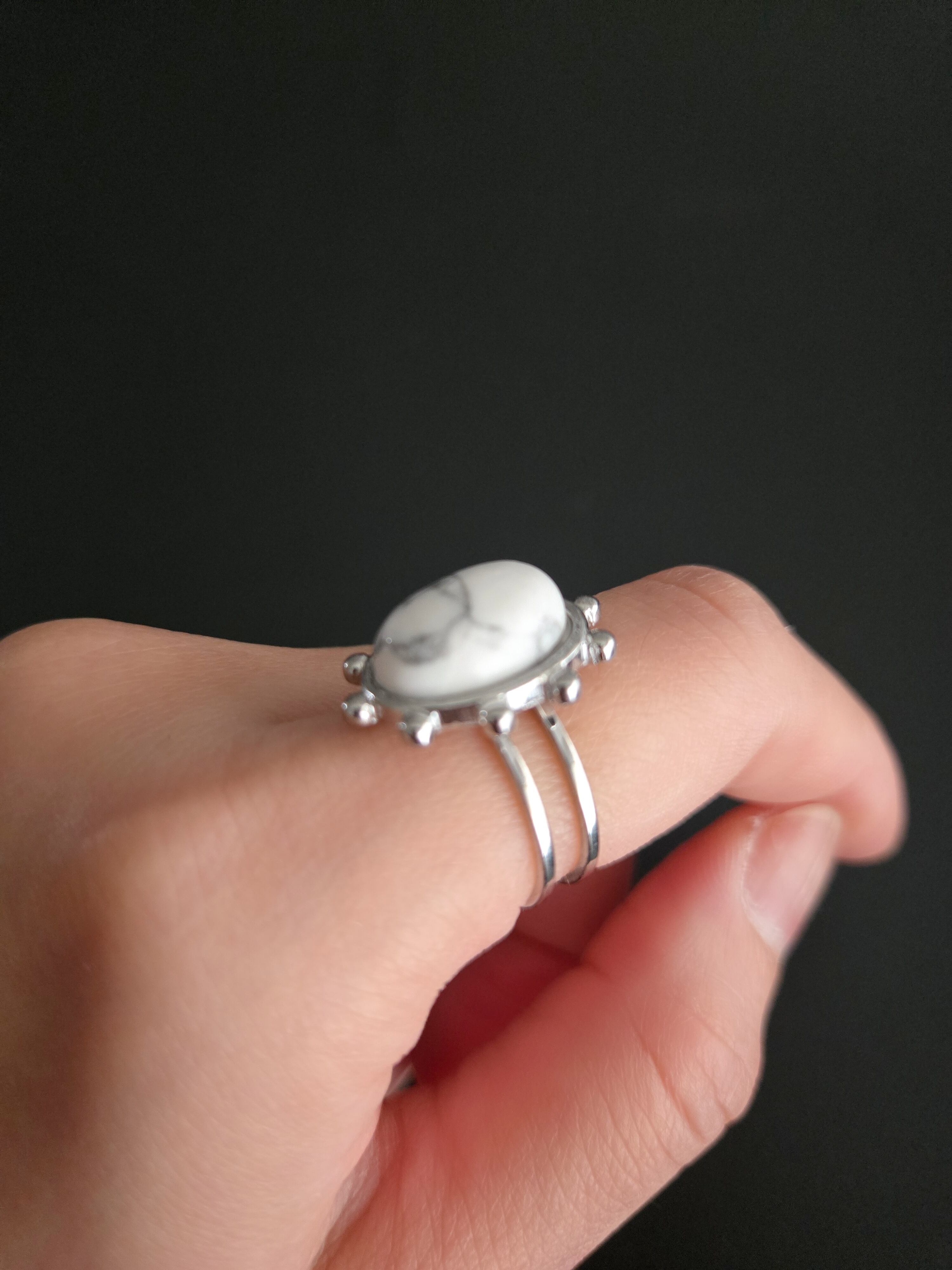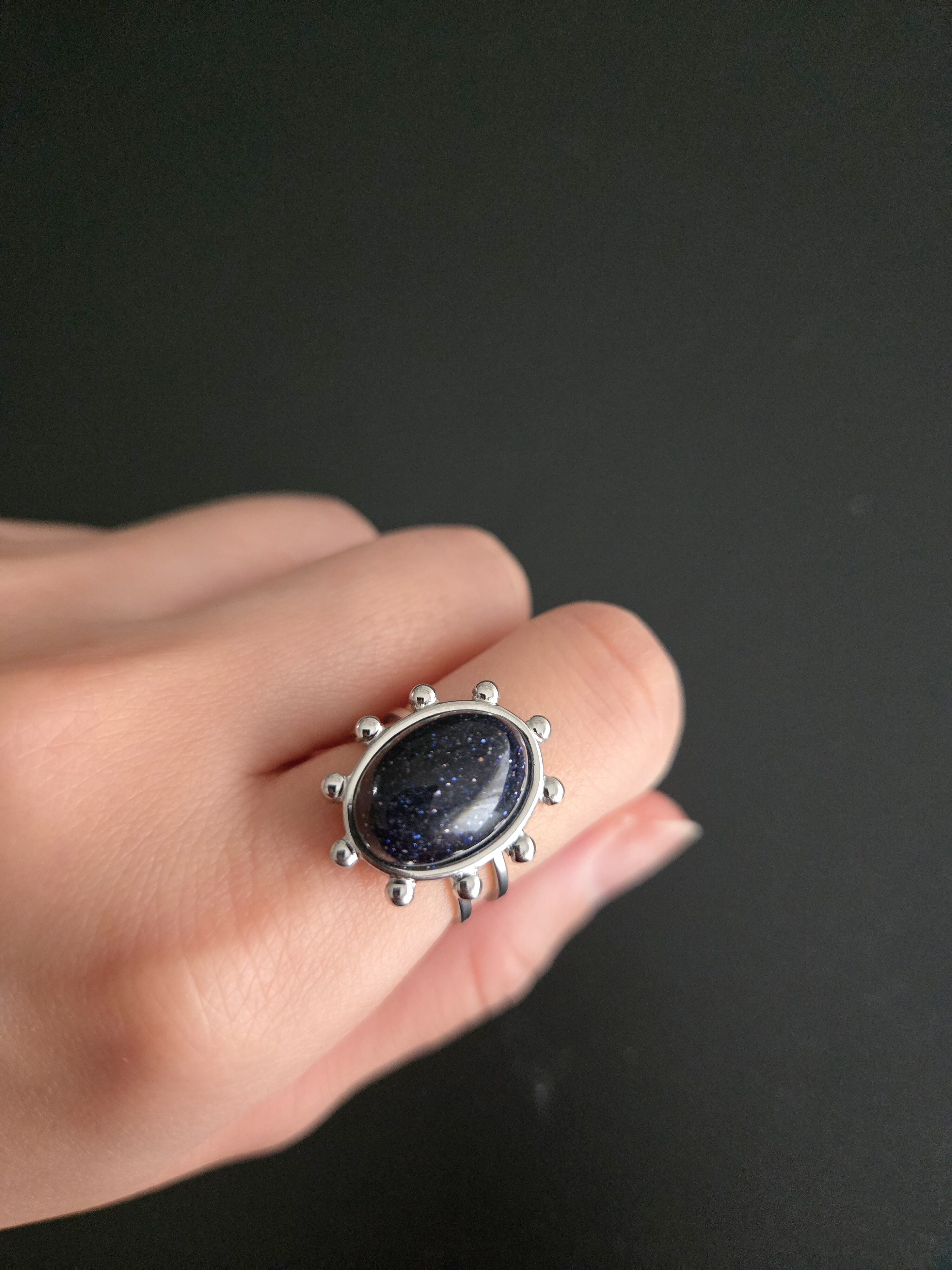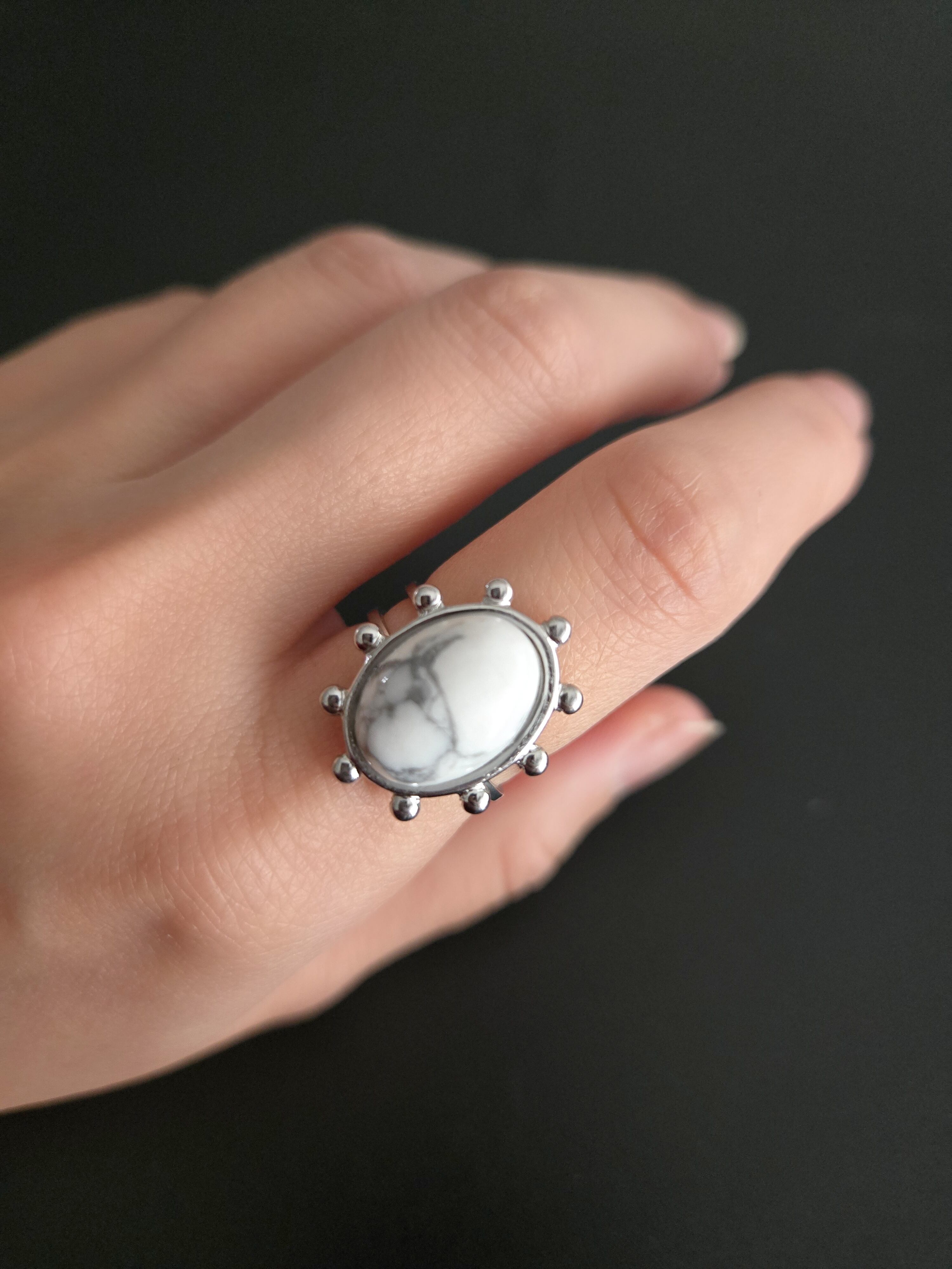 大きなオーバル型の天然石を中心に、繊細な粒状の装飾を施したユニークなデザインリング。